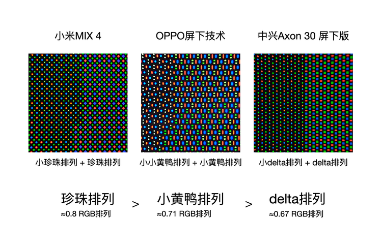 小米MIX 4的CUP像素采用了珍珠排列的小珍珠排列,中興是小delta排列,OPPO是小小黃鴨排列。