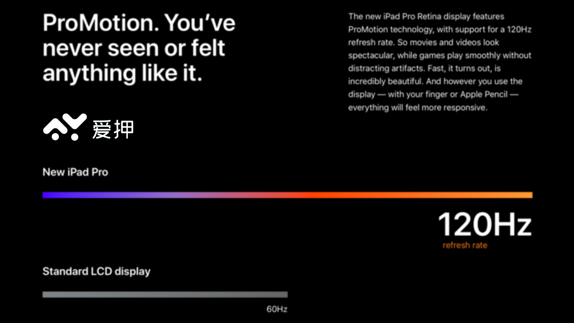 ProMotion屏幕支持120Hz可變刷新率,即可以將屏幕的刷新速度在24-120Hz之間動(dòng)態(tài)調(diào)節(jié)。