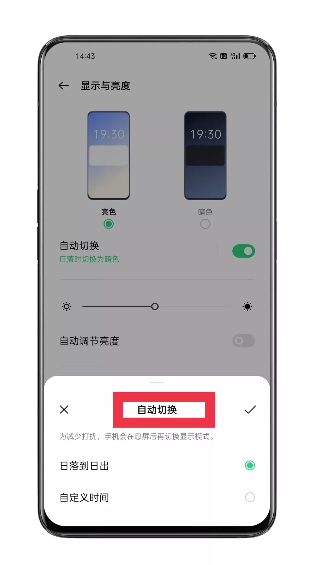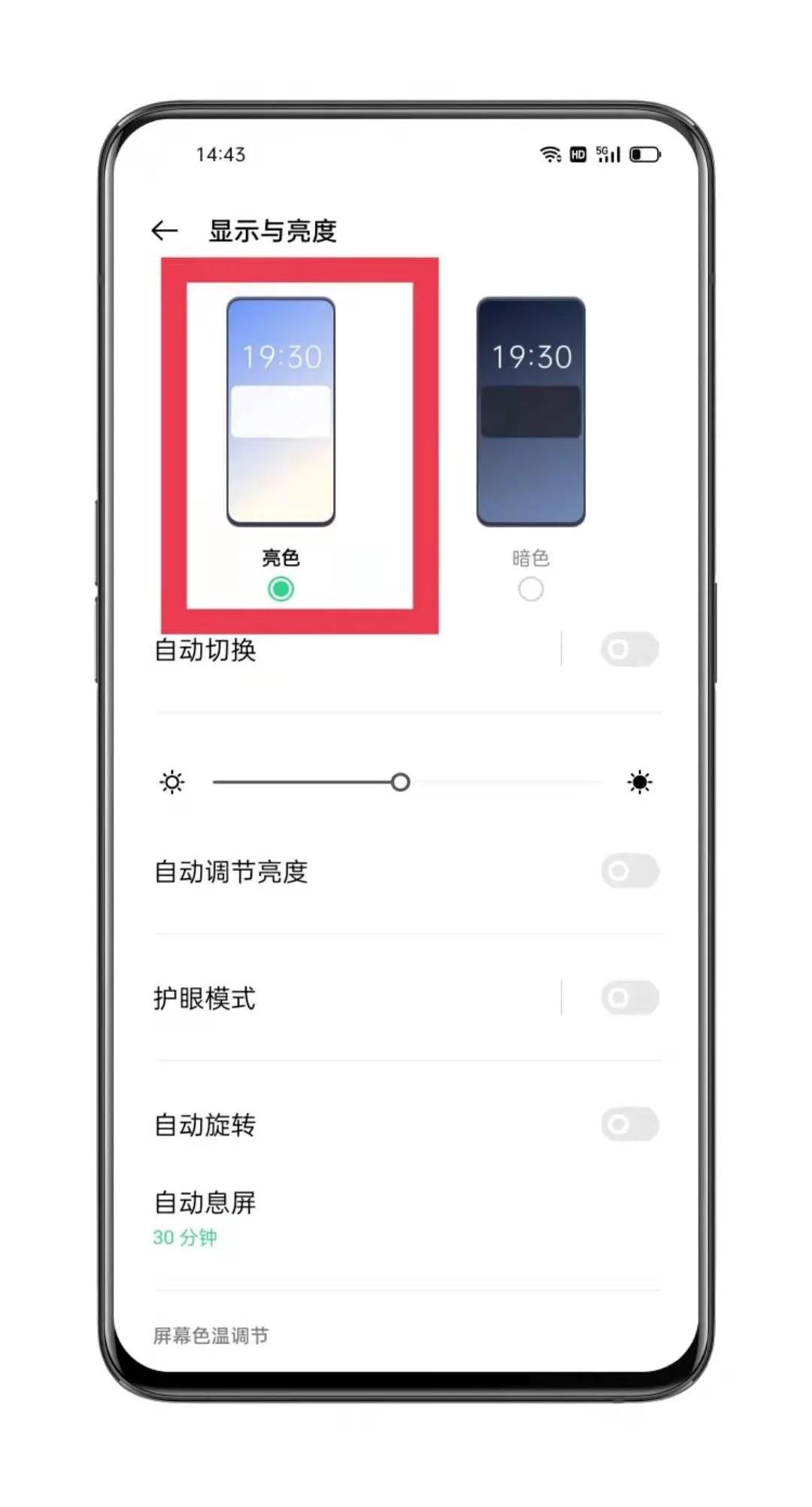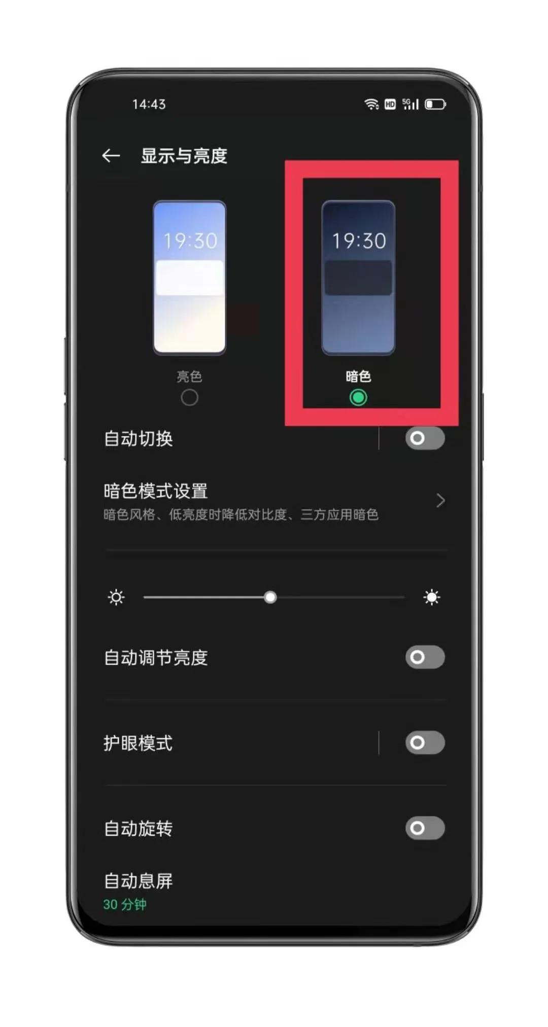 點擊【設置】-【顯色與亮度】或者長按下拉菜單中【暗色模式】即可進入調節