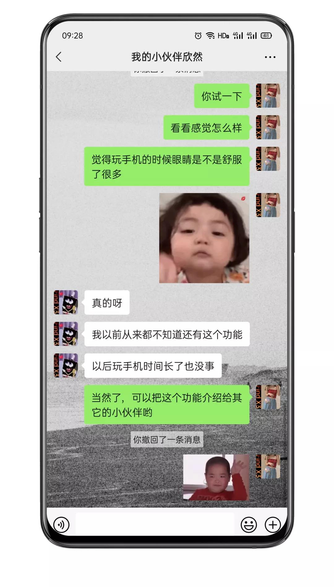 她竟然吐槽手機充電太快,眼睛連休息的時間都沒有了,于是我便仔細的向她科普,OPPO手機如何調節護眼模式,保護她的眼睛健康