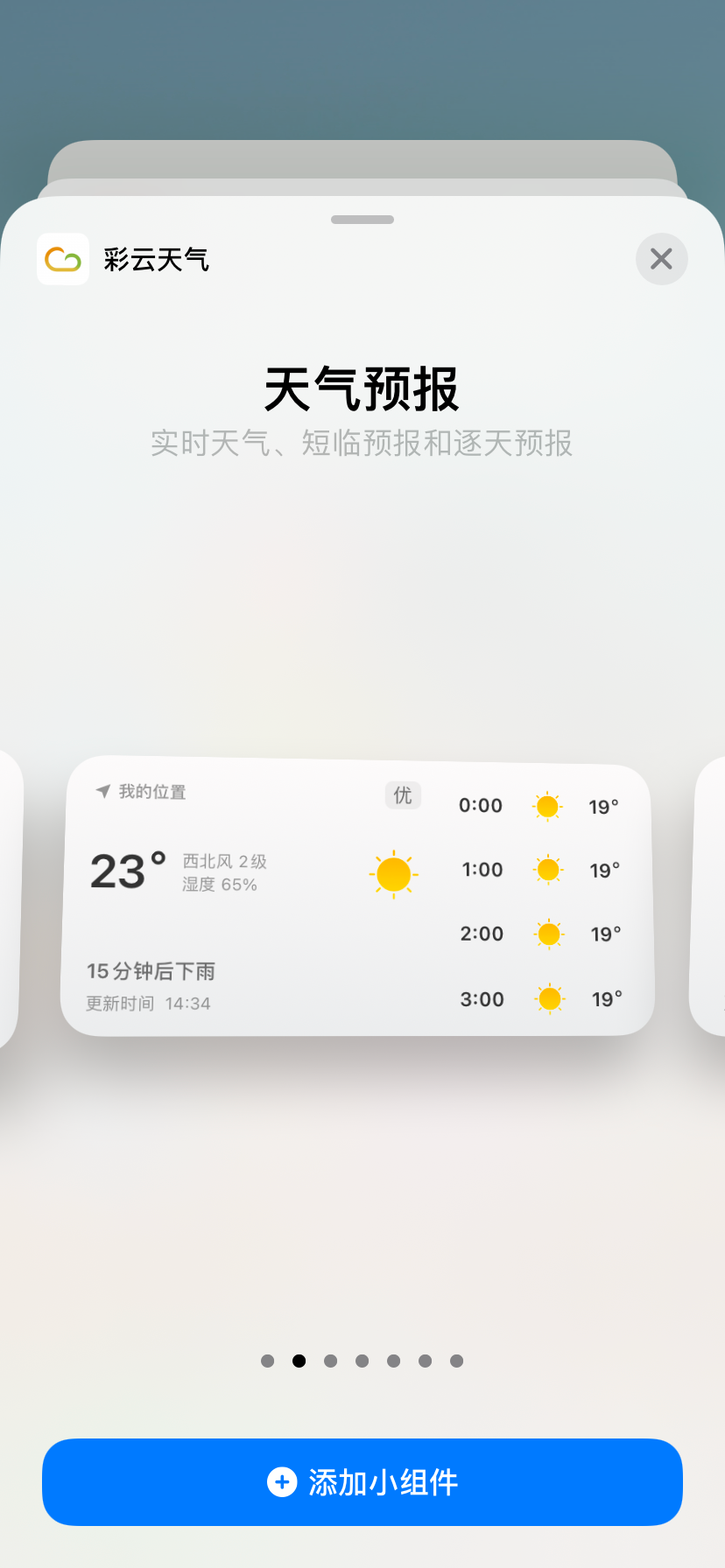 首先是天氣小組件,將它放在桌面可以一目了然了解到天氣信息。你也可以選擇第三方天氣小組件,比如小翼用的彩云天氣。相比自帶的天氣桌面小組件,它的優勢就是大號、中號組件能夠提醒你未來幾小時的天氣變化。例如何時下雨,何時雨停,何時大雨變小等等。