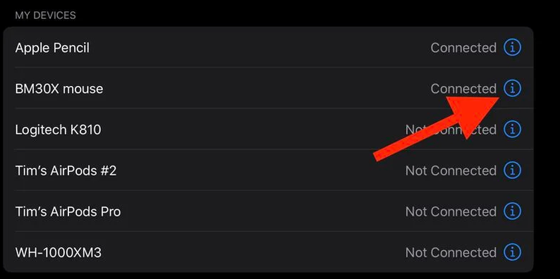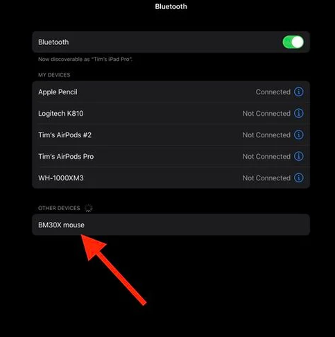 觸摸板或電腦鼠標(biāo)應(yīng)發(fā)生在「別的機(jī)器設(shè)備」下的「藍(lán)牙設(shè)置」中。點(diǎn)一下其名字將其接入到iPad;