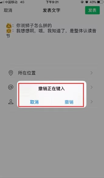 注意:提示撤銷正在鍵入,這是因?yàn)閷儆诙秳?dòng)不穩(wěn)定狀態(tài)。在iP按到上發(fā)送消息內(nèi)容,有時(shí)會(huì)彈出一個(gè)對(duì)話框“撤銷鍵入、取消”,這是在編輯的時(shí)候晃動(dòng)兩三下iP按到,出現(xiàn)的一個(gè)對(duì)話框。可以一鍵撤銷、刪除正在編輯的東西,無需一個(gè)字一個(gè)字的刪除,減少觸屏次數(shù),省去時(shí)間。全部刪除以后,如果感覺剛才刪除的文字還有用,可以再晃動(dòng)兩三下,又會(huì)出現(xiàn)一個(gè)對(duì)話框,點(diǎn)擊“重新鍵入”,就會(huì)把原來的內(nèi)容找回來。