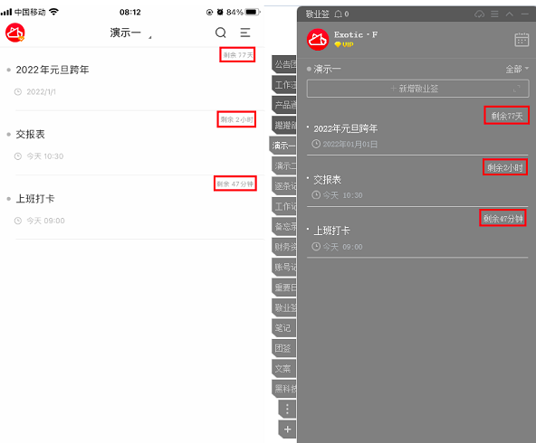 必須特別注意的是,敬業簽在默認下是無法顯示倒數計時的,必須設定一下才能夠,以iPhone敬業簽為例子,在主界面從從左往右滾動開啟側滑菜單欄,隨后點一下我的-通用性設定-表明內容時間-剩下期滿時間。設定好以后,設定了提示的內容右上方便會表明倒數計時了,而且在別的手機上和Windowspc端也適用表明倒數計時。