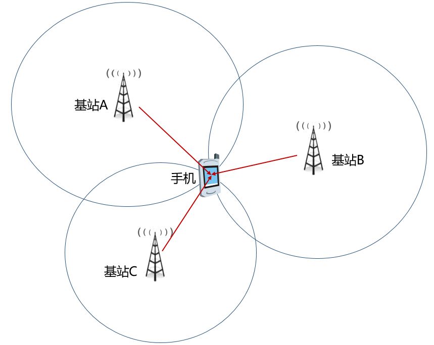 通常,在城市中,一部手機(jī)會在多個基站的信號覆蓋之下。手機(jī)會對不同基站的下行導(dǎo)頻信號進(jìn)行“測量”,得到各個基站的信號TOA(到達(dá)時刻)或TDOA(到達(dá)時間差)。根據(jù)這個測量結(jié)果,結(jié)合基站的坐標(biāo),就能夠計算出手機(jī)的坐標(biāo)值。