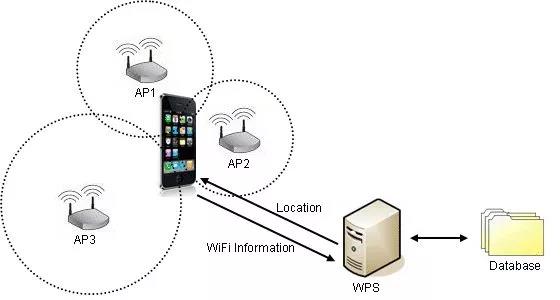 當(dāng)一個設(shè)備處在這樣的網(wǎng)絡(luò)中時,可以將收集到的這些能夠標(biāo)示AP的數(shù)據(jù)發(fā)送到位置服務(wù)器,服務(wù)器檢索出每一個AP的地理位置,并結(jié)合每個信號的強(qiáng)弱程度,計算出設(shè)備的地理位置并返回到用戶設(shè)備,其計算方式和基站定位位置計算方式相似,也是利用三點定位或多點定位技術(shù)。